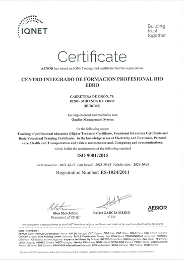 El VI Plan General de Formación Profesional de Castilla y León, incluye el Programa Operativo 03: “aseguramiento de la Calidad en los proveedores de Formación Profesional”, con el objetivo de “impulsar la renovación de los Certificados del Sistema de Gestión de la calidad conforme a la norma ISO 9001:2015”; “revisar el seguimiento de los indicadores por parte de los CIFP”; e “impulsar la certificación del Sistema de Gestión de la Calidad de los CIFP de reciente creación”.