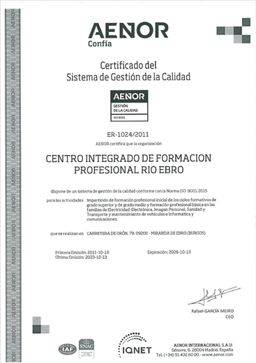 Se ha demostrado, una vez más, que el C.I.F.P. Río Ebro está cumpliendo con los requisitos de la Norma y con el resto de criterios de la auditoría, obteniendo evaluación conforme en dichas acciones. Este hecho manifiesta que el centro se compromete a implantar de forma continua y eficaz el Sistema de Gestión de Calidad.